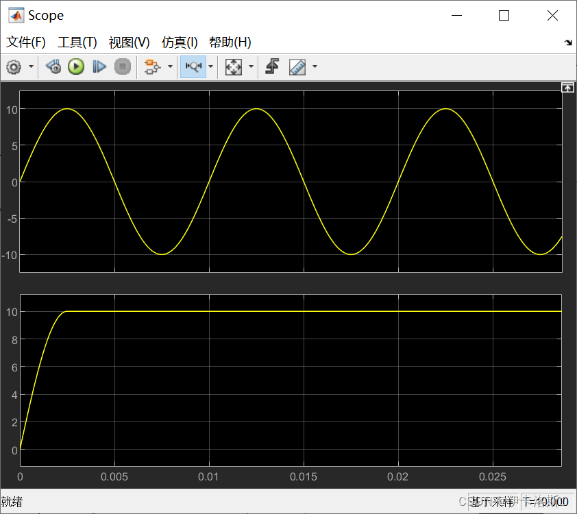 很多时候会需要对某一段信号取其中的最大值和最小值,如下图输入幅值为10的正弦信号,对其求取最大值得到10,与前一个取最大最小值不同的是只是一个信号,但是有时间先后,前一个是无先后顺序且同时。