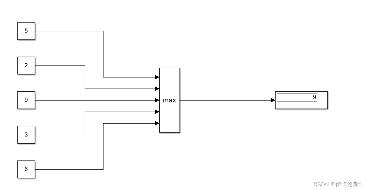 第一个,比较同时输入的数据中最大的值,这个比较简单,可以比较并行输入的数据,直接用Minmax模块,如下输入数据最大为9.