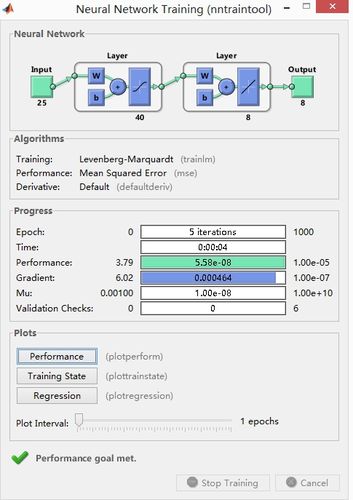 8单击train,开始训练。9训练过程跳出的小窗口。10训练结果。其中MSE表示均方差,R表示相关系数。单击next。11这里可以调整神经网络,也可以再次训练。单击next。