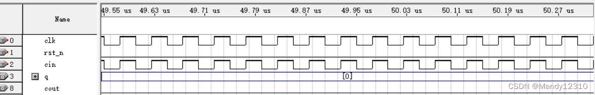设置cin为1即可实现。注意不是cin=clk,这会导致输出一直为0,如下图所示。