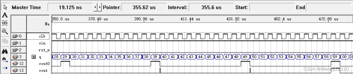 注意 :该写法中进位的状态转移进程不能用上升沿触发,因为两个进程是并行的,所以会在0时才输出进位。但是该写法进位会产生毛刺,如图: