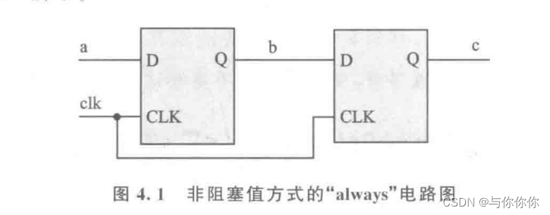 always @(posedge clk) begin b <= a; c <= b; end //定义了两个reg型信号b和c,clk信号的上升沿到来时,b就等于a,c就等于b。 //非阻塞赋值b<=a;c<=b;两条语句是同时执行的。赋值是在“always”块结束后执行的,c应为原来b的值,这里用到了两个触发器,这个“always”块实际描述的电路功能如图所示。