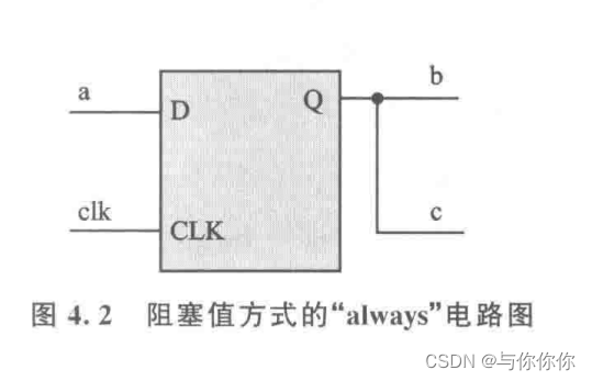 always @(posedge clk) begin b = a; c = b; end //阻塞赋值b=a;c=b;两条语句先执行b=a后执行c=b,最终的结果是c = a。阻塞赋值方式:clk信号的上升沿到来时,b马上取 a的值,c马上取b的值(即等于a) ,生成的电路如图所示,只用了一个触发器来寄存a的值,又输出给b和c。
