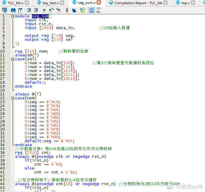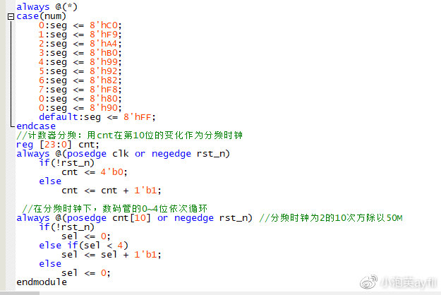 always @(posedge cnt[10] or negedge rst_n) //分频时钟为2的10次方除以50M