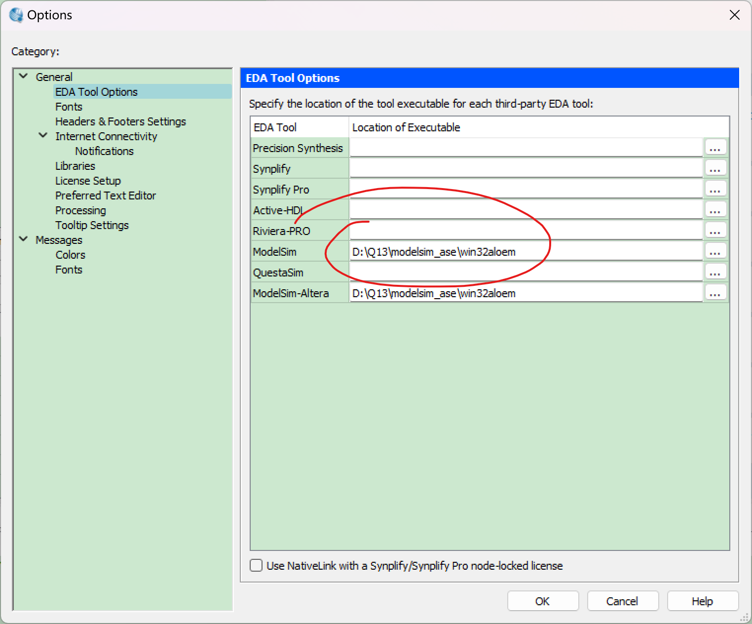 解决办法:按照图示依次点击Tools->Options->General->EDA Tool Options->ModelSim 把路径设置为ModelSim软件所在处。