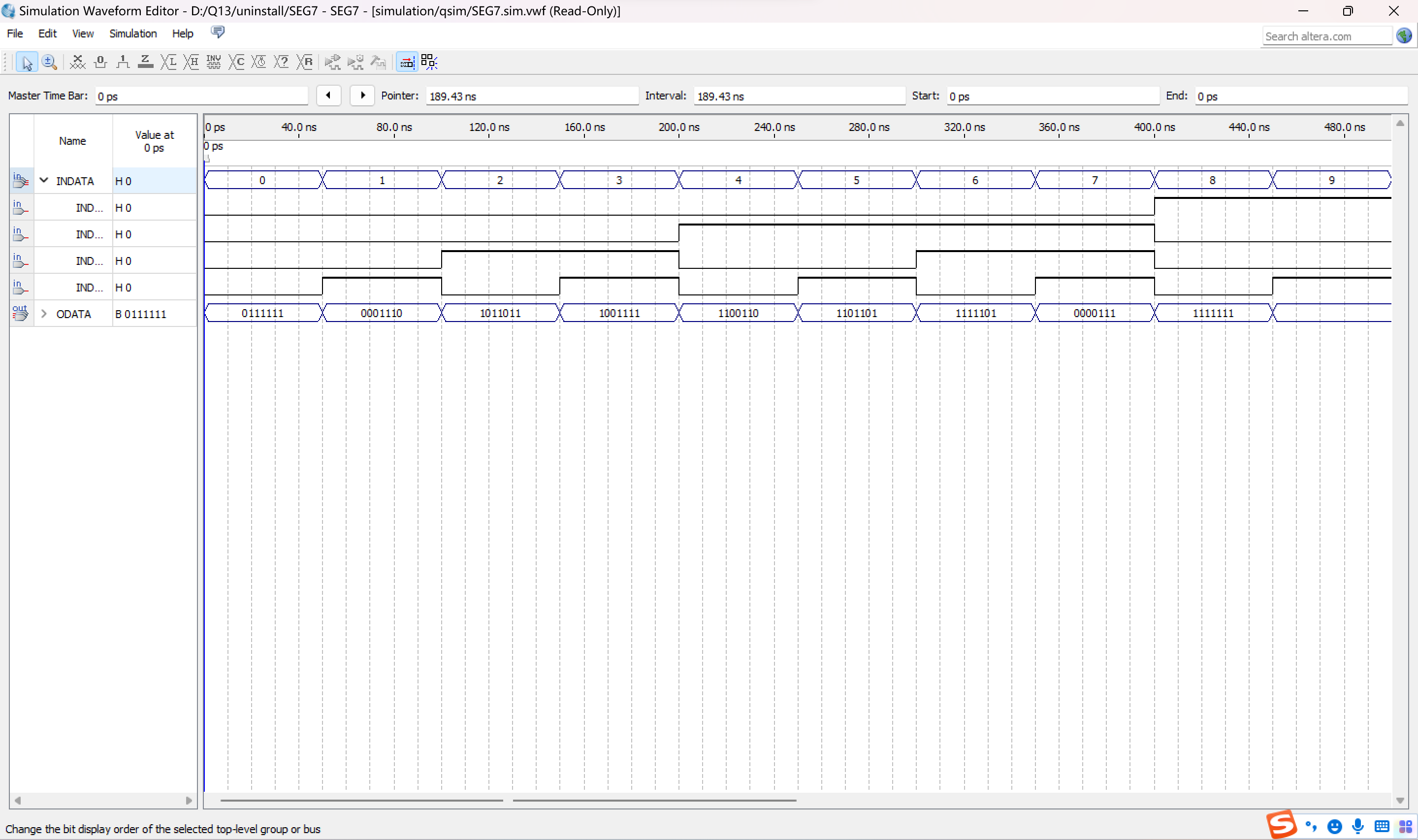 由仿真波形可知,数字0-9均可用八位二进制数表示出来,且结果是一一对应的;