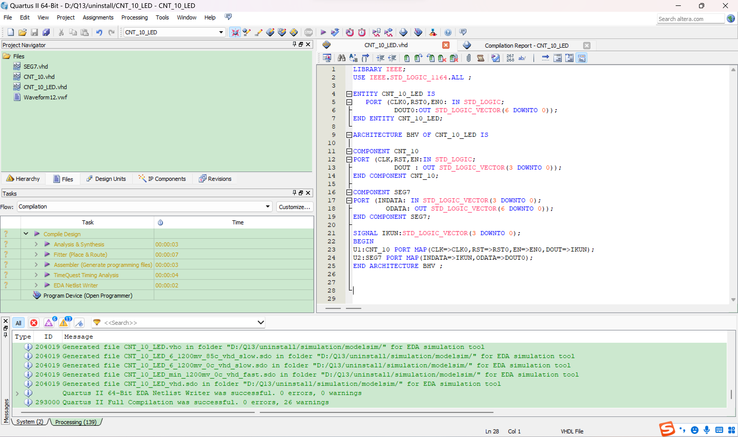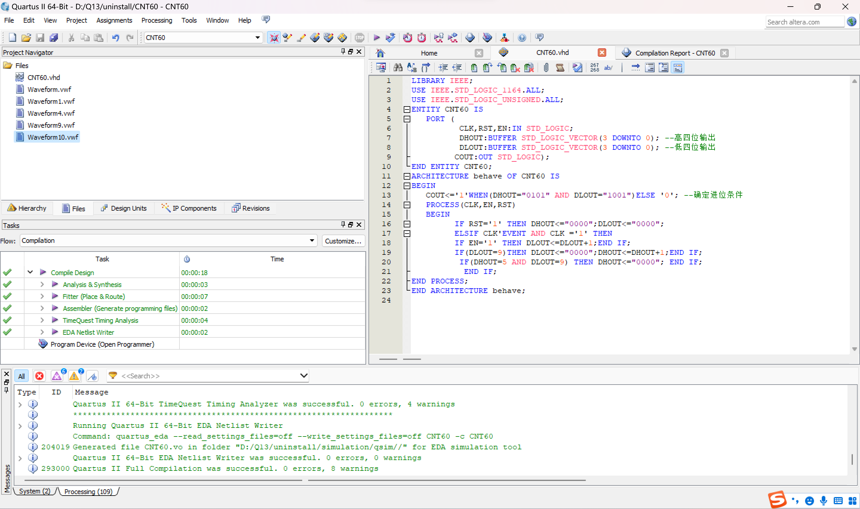 以上就是可耐荷花最近收集整理的关于【EDA技术】 实验二 BCD码输出的60进制计数器的VHDL一、实验目的二、实验要求三、实验步骤四、VHDL程序文本五、遇到的问题及解决办法的全部内容,更多相关【EDA技术】内容请搜索靠谱客的其他文章。