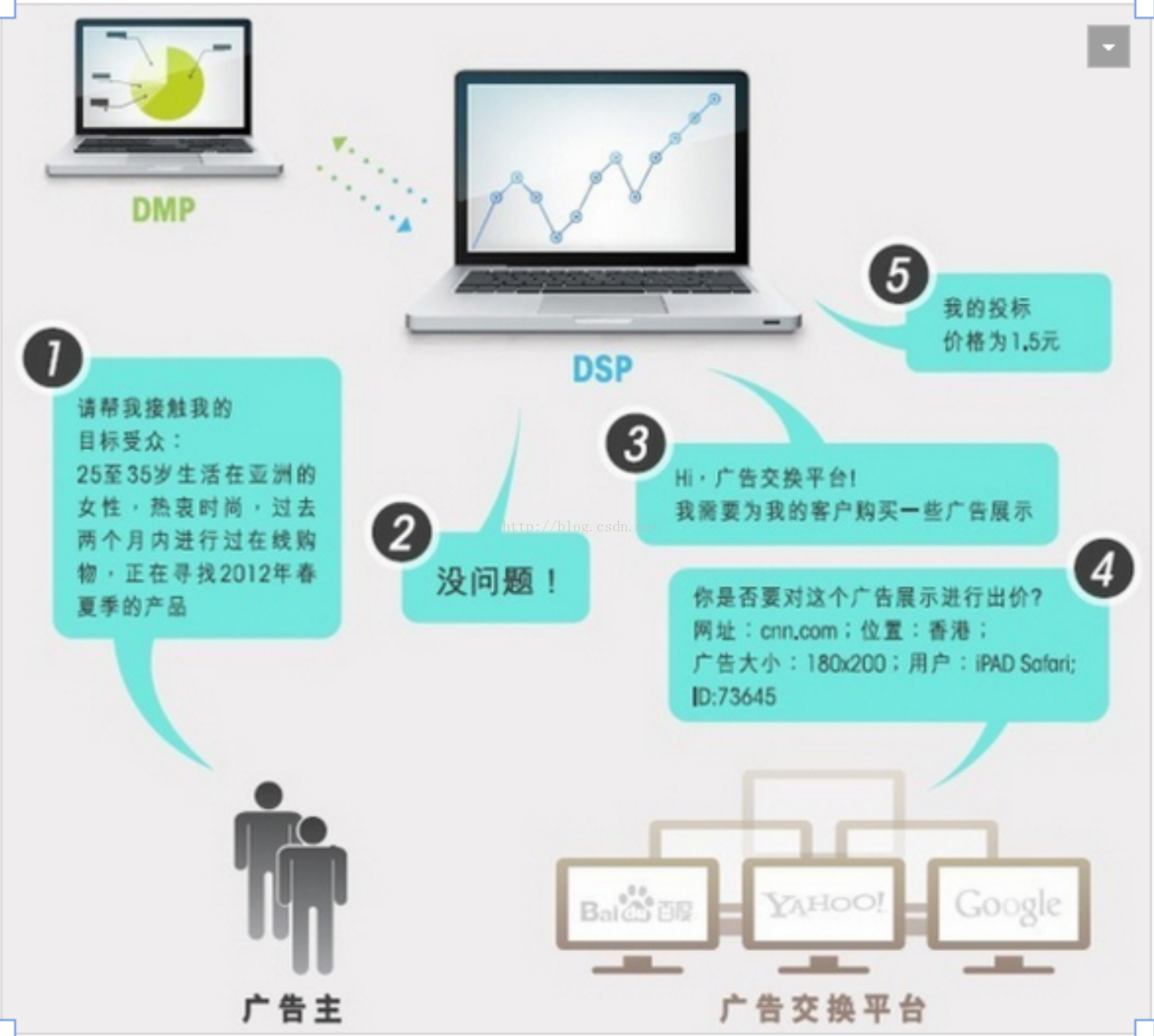 先简单解释下基本的:DSP(Demand Side Platform)是需求方平台,负责接受投放需求,找人群数据,实现投放竞价等功能的那么一个中央管理控制平台。DMP(Data Management Platform)是数据管理平台,负责数据汇集和按需要与DSP进行数据交换,下面看一个图: