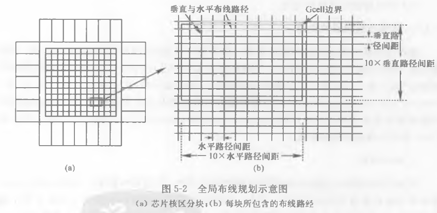 全局布线对整个芯片的走线做全局规划,以便确定即使是很大的芯片设计它的最终布线计划也能实现。全局规划是一种“松散”的布线,它将芯片核区预先划分成若干大方块(也可以是长方块),每个方块纵横方向可以走多条线(例如,10条线,线的数目根据设计特征也可以修改)。这样布线时可以同时规划多条走线方案,极大地加快速度并尽早报告结果,以便进行调整或修改。