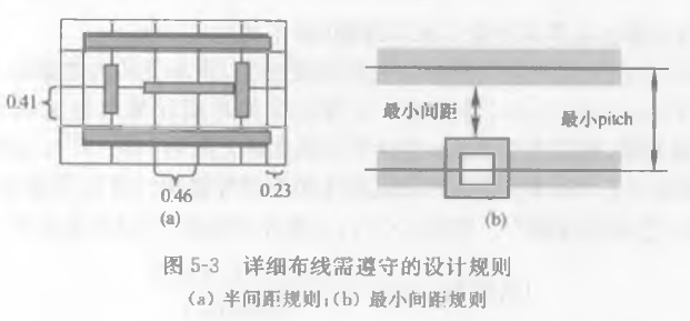 做详细布线时要遵循各种设计规则。除了遵守在版图设计时的线宽和间距外,布线是依据“布线间距”(pitch)进行的。当深亚微米(DSM)芯片(小于0. 35um)开始使用多层金属连线时,新工艺技术产生了新的规则要求。纳米设计中,由于化学机械打平(CMP,chemical mechanical polishing)的作用所提出的密度要求及由于掩模光刻(lithograph)的限制而提出的光学邻近校正(OPC,optical proximity correction)的要求,是设计布线规则的新特征。