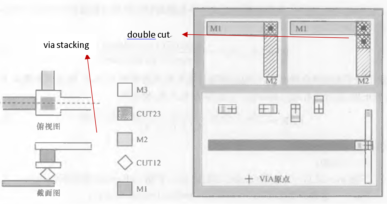DSM芯片设计工艺开始用到通孔叠砌(via stacking)技术,为了保证接触的可靠性,还需要遵守最小面积规则(MAR,minimum area rule),在空间允许的情况下,则可以采用双通孔(double cut)技术。