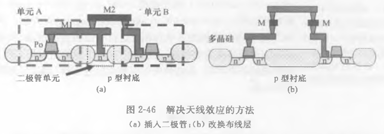 在现代等离子体蚀刻工艺和离子注入过程中产生的积累电荷,如果得不到及时释放,就会对CMOS器件的栅极产生击穿并造成永久性的损伤,这就是工艺天线效应(PAE,process antenna effect)。所谓天线,是指在两次工艺之间连接到栅极多晶硅(poly)和金属线处于悬空不接地的状态而形成的天线结构。为了预防工艺天线效应,在最终布线过程中,是通过连接天线二极管(antenna diode)或跳转到上一层金属(layer hopping)以增强CMOS栅极的静态电荷承受能力来实现的。