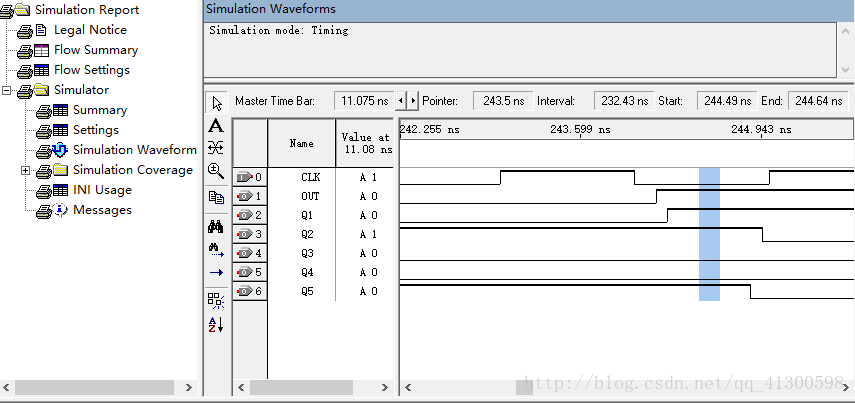 4.编译完成后开始仿真,在Node Finder处添加输入管脚,并输入波形,观察仿真结果。