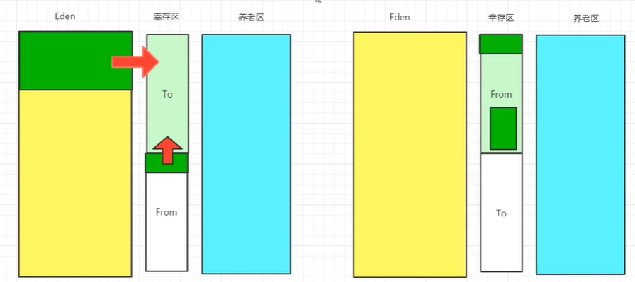 经过异常GC后,eden去和幸存from区被情况,from区和to区会交换角色,被清空from变成新的to区