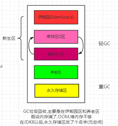 - 堆里面的分区有哪些?Eden,form,to,老年区,说说他们的特点!