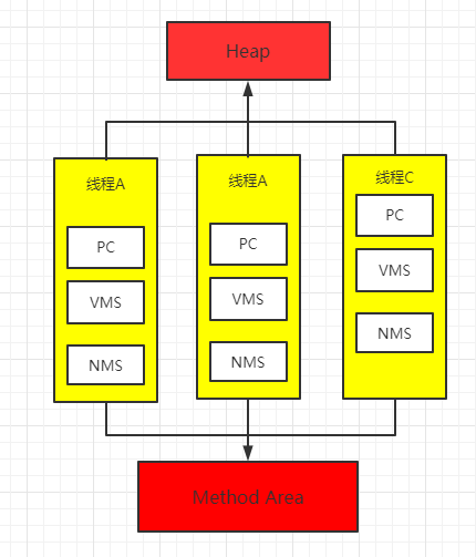PC(程序计数器),VMS(虚拟机栈),NMS(本地方法栈)