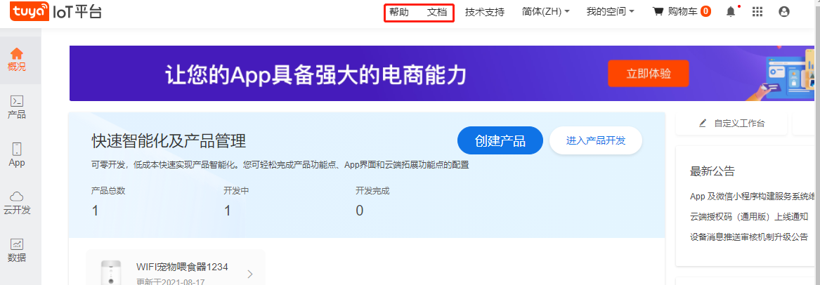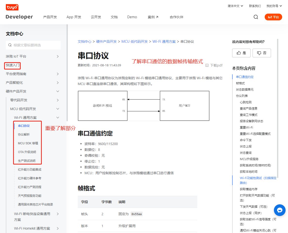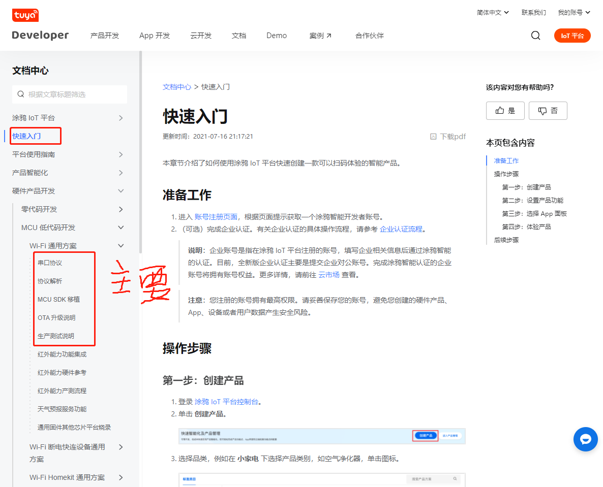 1. 细看以下红框内文档。根据五分钟快速入门 创建test产品。详细了解MCU利用WiFi模块接入IOT平台。协议传输相关命令字和传输格式为重点(涂鸦平台数据流)