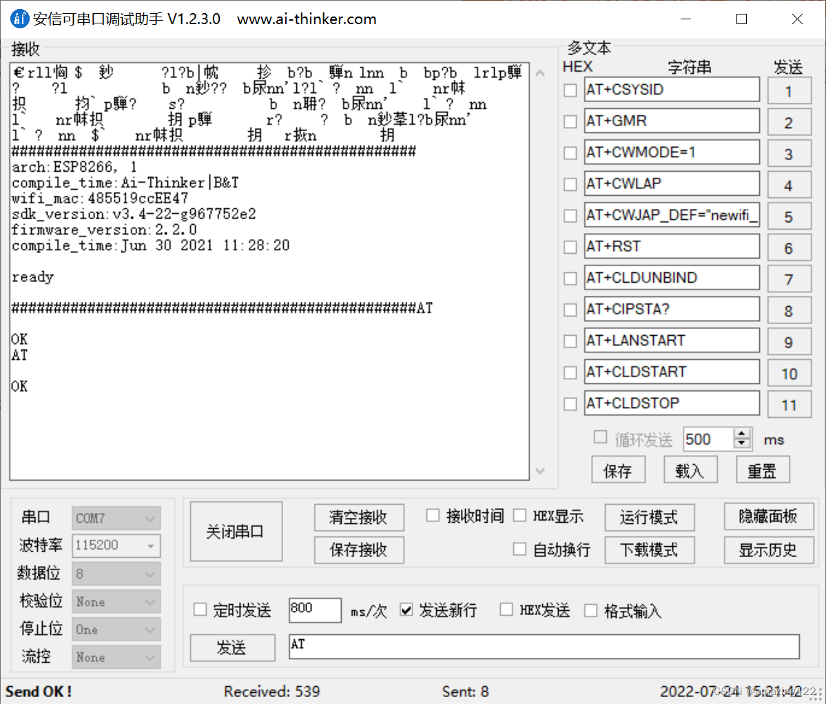 打开后会有乱码,不用管它。我们输入AT,然后点击发送。