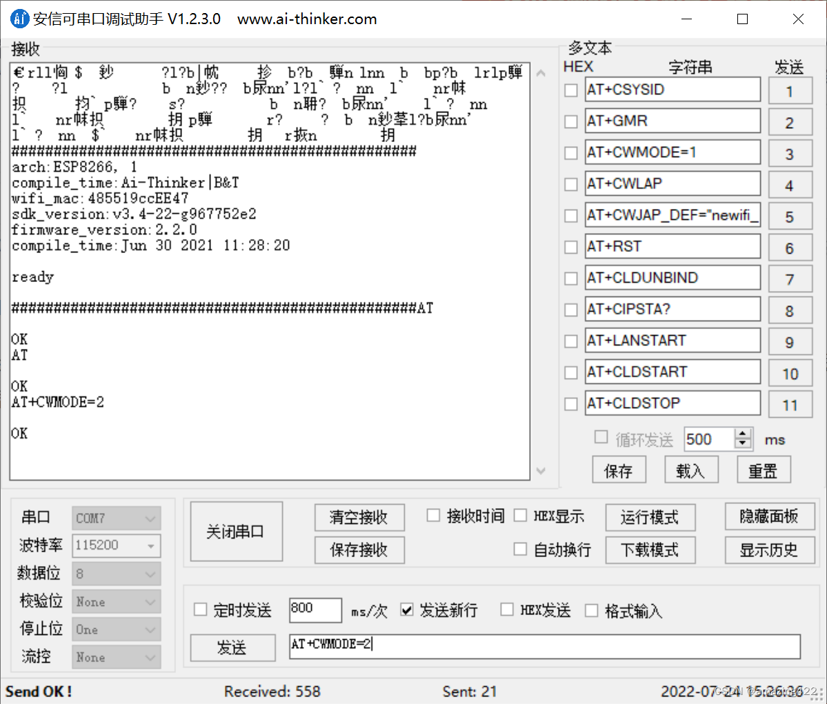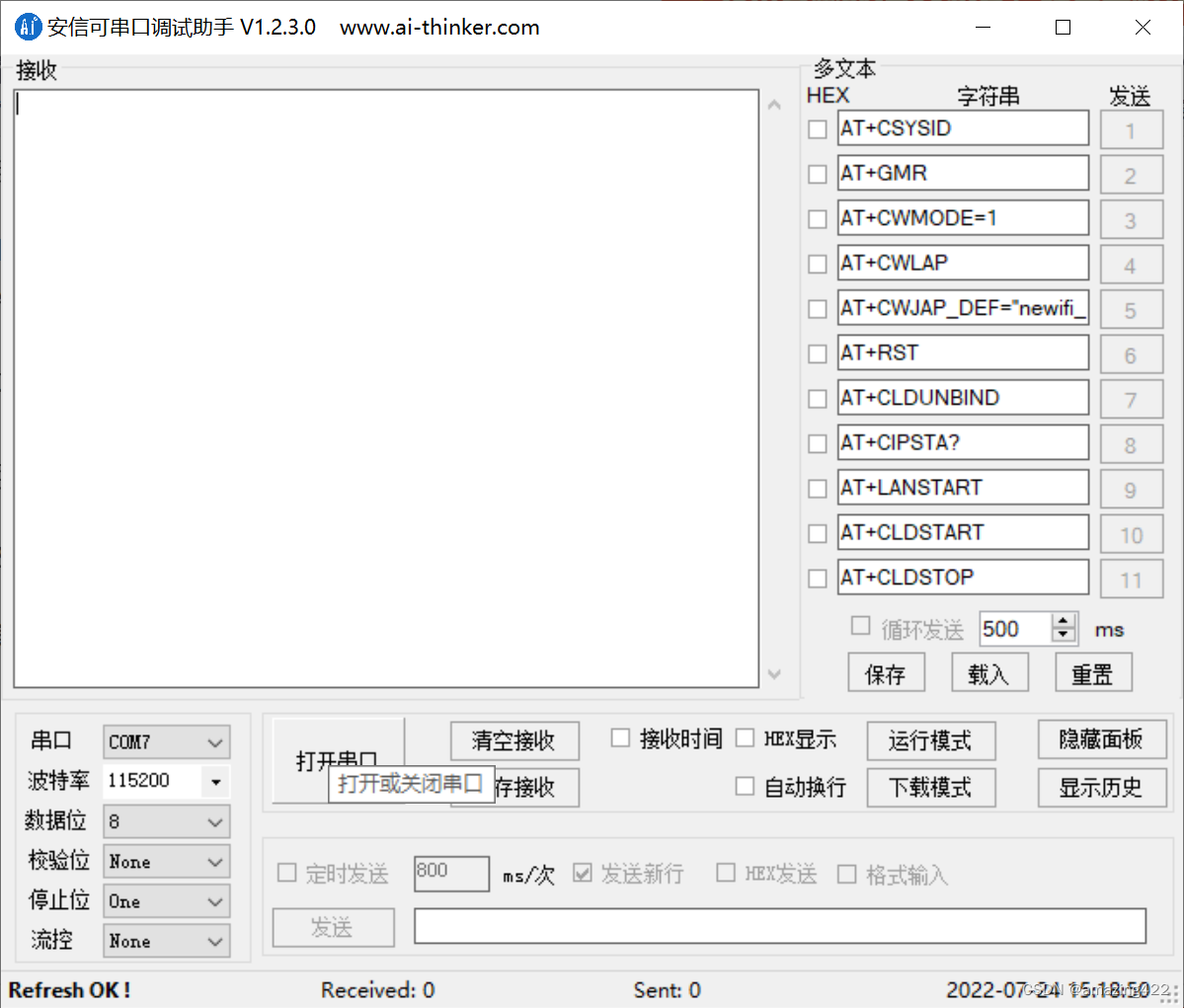 我们将esp01s插在固件下载器上,然后在电脑端打开安信可串口调试助手,选择串口并打开,如下图