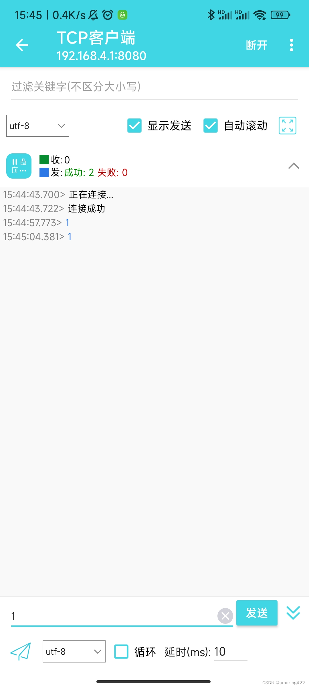 然后再通过手机WiFi端,连接esp8266后,我们在手机上发送1。