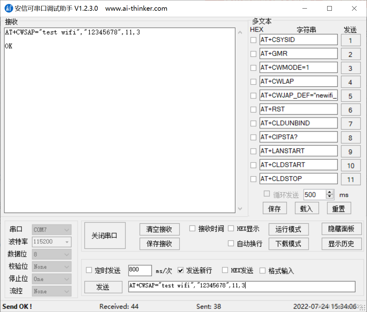 然后发送AT+CWSAP="test wifi","12345678",11,3(意思是将WiFi名称设置为test wifi,密码设置为12345678,11是通道号,3是WPA2_PSK密码类型。)