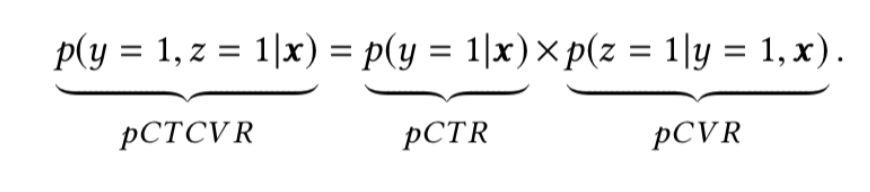 ctr就是点击率,cvr是转化率,ctcvr是点击转化率,即既点击又转化的概率,下面是三者的关系式: