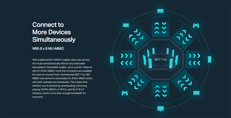 WiFi 5对应的802.11ac分为了Wave 1和Wave 2两个阶段,后者可以视为WiFi 5的完全体,而这两者之间的一个重要区分就是后者引入了MU-MIMO(多用户多进多出)而前者是SU-MIMO(单用户多进多出)。WiFi 6则延续了WiFi 5的MU-MIMO,而且支持的数据链路从4条升级到了8条,也就是可以支持8x8 MU-MIMO,这也是WiFi 6的无线带宽相比WiFi 5会有明显增长的重要原因。