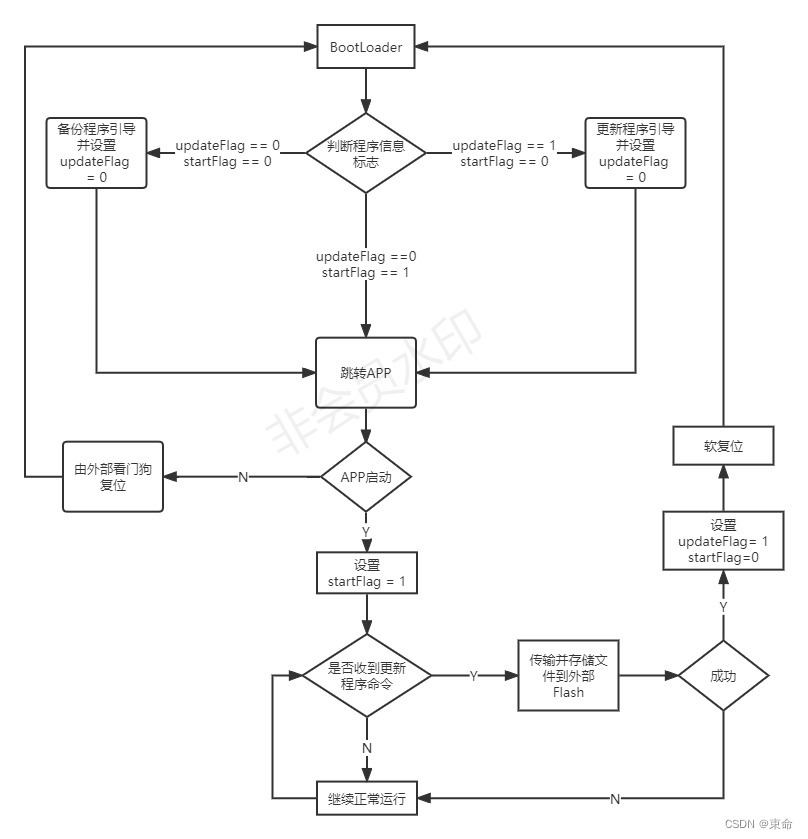 当更新的程序有bug,或者引导时遇到中途掉电的情况,均会导致跳转失败。此时,updateFlag == 0 && startFlag == 0,重新引导备份程序。成功跳转APP启动之后,置位startFlag = 1。之后再次上电就可以直接跳转APP,不再执行引导。