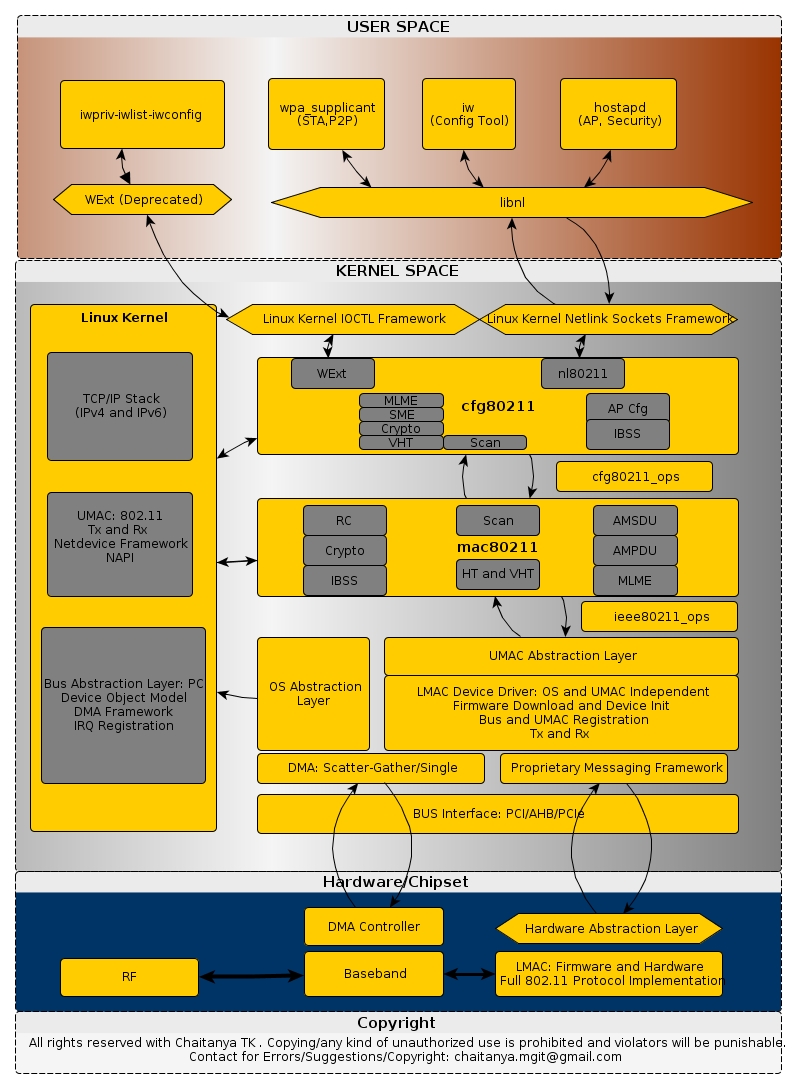 cfg80211:用于对无线设备进行配置管理,与FullMAC,mac80211和nl80211一起工作。