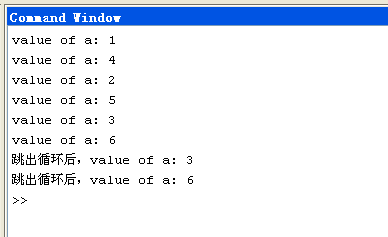 % 定义变量 % ii ---循环变量,也就是循环次数 clc;clear; for ii = [1 2 3; 4 5 6] fprintf('value of a: %dn', ii); end fprintf('跳出循环后,value of a: %dn', ii);