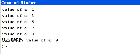 % 定义变量 % ii ---循环变量,也就是循环次数 clc;clear; for ii = [5 9 7] fprintf('value of a: %dn', ii); end fprintf('跳出循环后,value of a: %dn', ii);