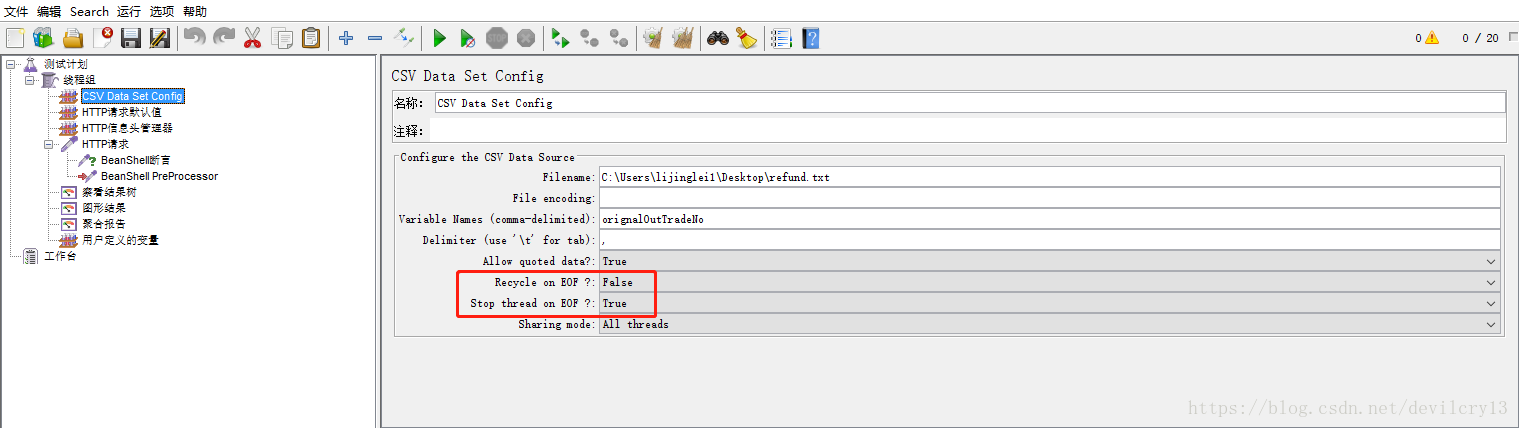 将配置中默认配置项Recycle on EOF = True ,Stop thread on EOF = False改为Recycle on EOF = False ,Stop thread on EOF = Ture,循环再次运行时读取CSV Data就不会重新从第一行开始读了,会接着前面的往下读。
