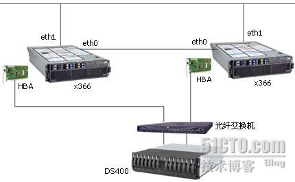 - 采用x366作为服务器平台,采用光纤存储DS400作为共享存储。