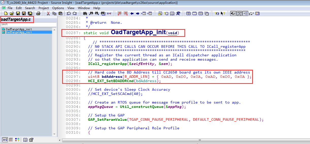 “C:tisimplelinkble_cc26xx_2_01_00_44423ProjectsbleOADTargetCC26xxSourceApplication”目录下的“oadTargetApp.c”文件中,相关代码截图如下: