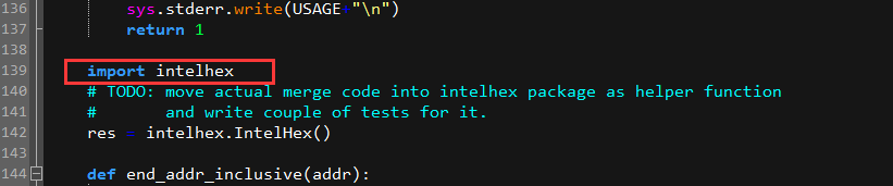 果然,不出所料的有更详细的提示信息,提示错误是导入“intelhex”模块的时候发现没有该模块,当然,我们也可以打开“hexmerge.py”脚本,然后看看错误提示中提到的139行的内容,来了解具体执行的地方,截图如下: