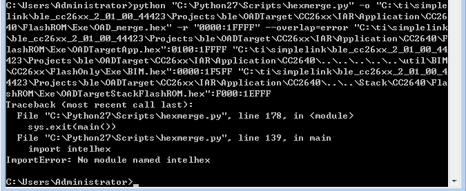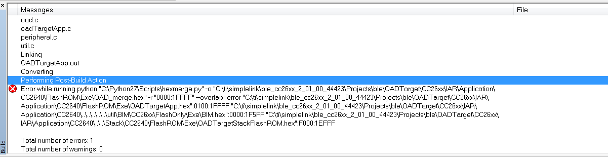 python "C:Python27Scriptshexmerge.py" -o "C:tisimplelinkble_cc26xx_2_01_00_44423ProjectsbleOADTargetCC26xxIARApplicationCC2640FlashROMExeOAD_merge.hex" -r "0000:1FFFF" --overlap=error "C:tisimplelinkble_cc26xx_2_01_00_44423ProjectsbleOADTargetCC26xxIARApplicationCC2640FlashROMExeOADTargetApp.hex":0100:1FFFF "C:tisimplelinkble_cc26xx_2_01_00_44423ProjectsbleOADTargetCC26xxIARApplicationCC2640..........utilBIMCC26xxFlashOnlyExeBIM.hex":0000:1F5FF "C:tisimplelinkble_cc26xx_2_01_00_44423ProjectsbleOADTargetCC26xxIARApplicationCC2640....StackCC2640FlashROMExeOADTargetStackFlashROM.hex":F000:1EFFF