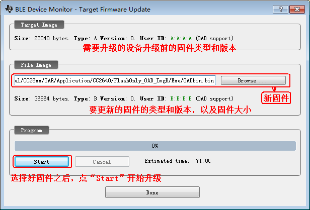 注意:用这个ImageA升级ImageB的话,如果用PC端的BLE Device Monitor或者安卓手机端的APP都会出现连接失败,或者搜索不到服务,或者搜索到服务之后过一会就断开,或者升级过程中断开连接等问题,这个问题的主要原因是ImageA的CC2640App开启了BLE连接成功之后自动申请修改连接参数的功能,在
