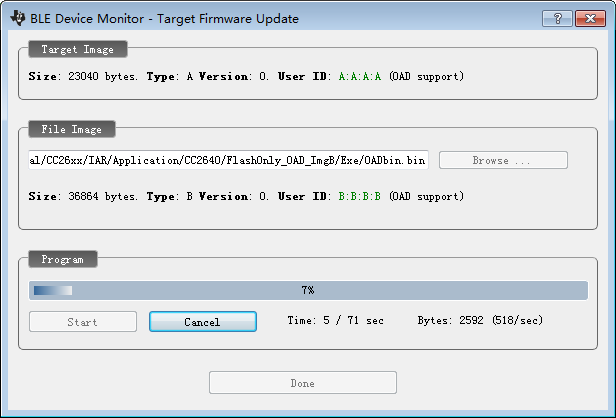 CC2640/FlashOnly_OAD_ImgB/Exe/OADbin.bin”目录下的该文件,选择之后,点击“Start”进行升级,升级过程如下: