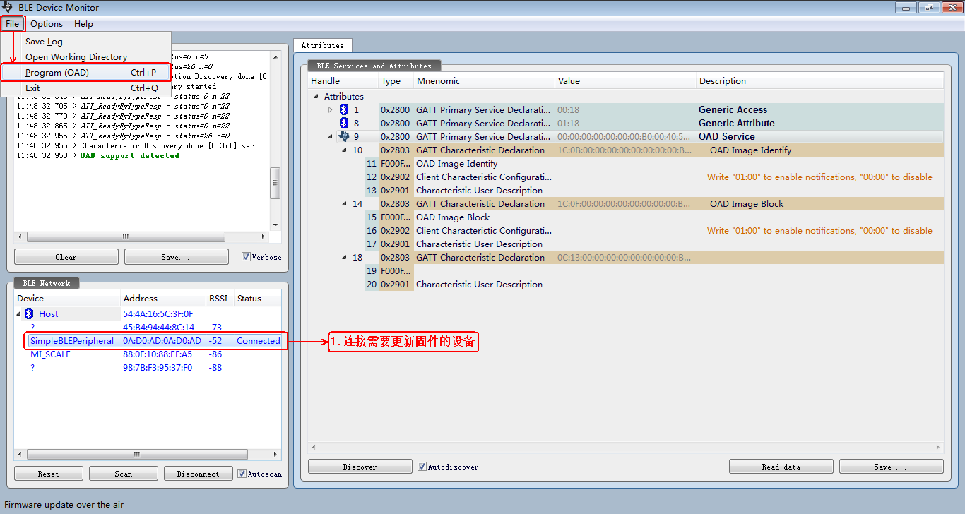 1.用BLE Device Monitor工具,搜索并连接我们要升级的设备,然后点击菜单栏上的“File”,在下拉菜单中选择“Program(OAD)”,操作截图如下: