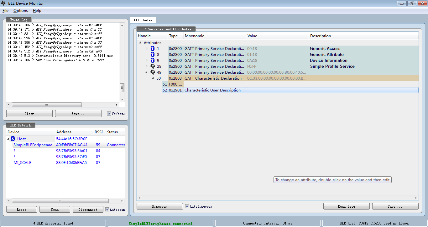 成功烧录之后,我们用PC端的BLE Device Monitor工具进行搜索和连接,之后可以看到相应的服务和特征值,截图如下: