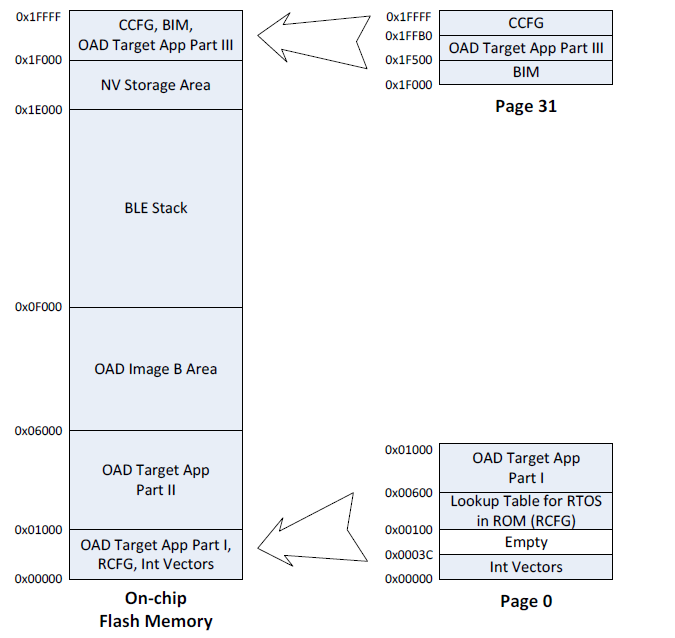 内置Flash的OAD固件升级配置之后,整个Flash中地址分配情况如下图: