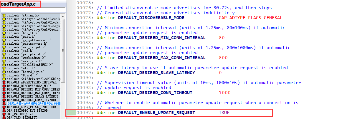 “C:tisimplelinkble_cc26xx_2_01_00_44423ProjectsbleOADTargetCC26xxSourceApplication”目录下的“oadTargetApp.c”文件中,相关代码截图如下: