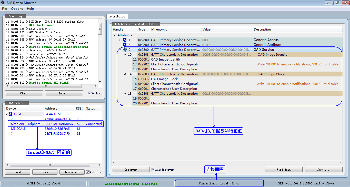 注意:用这个ImageA升级ImageB的话,如果用PC端的BLE Device Monitor或者安卓手机端的APP都会出现连接失败,或者搜索不到服务,或者搜索到服务之后过一会就断开,或者升级过程中断开连接等问题,这个问题的主要原因是ImageA的CC2640App开启了BLE连接成功之后自动申请修改连接参数的功能,在