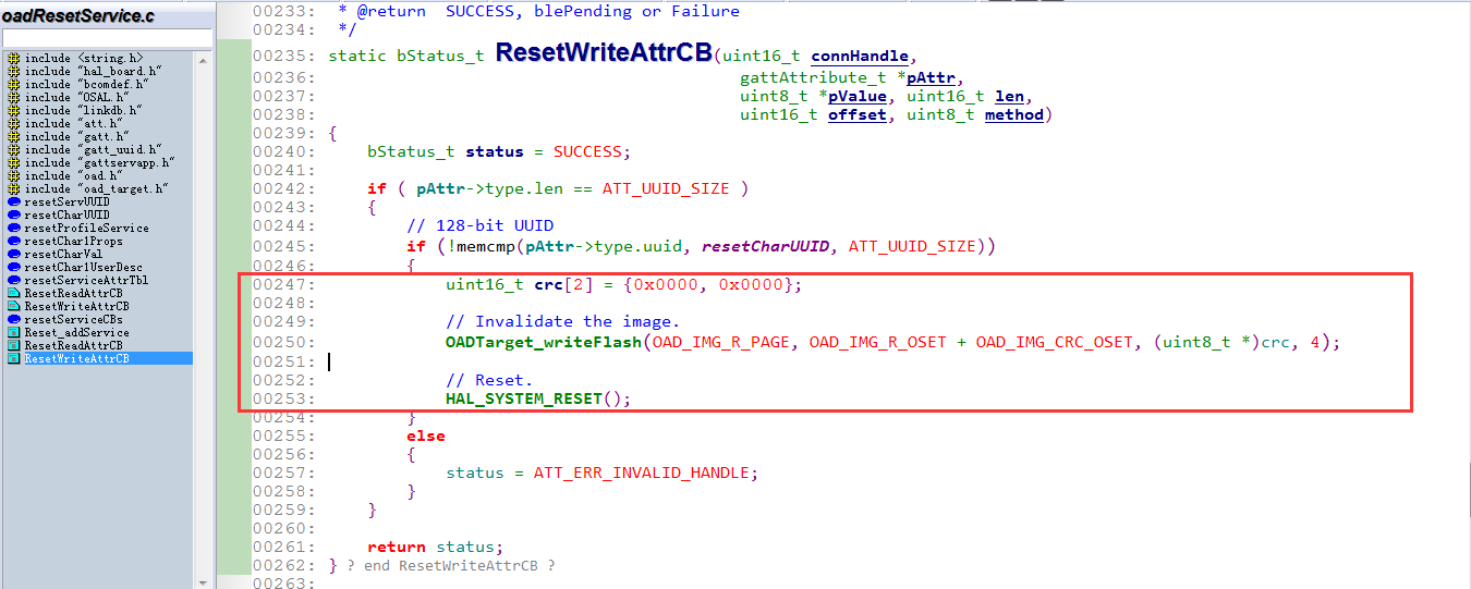 目录下的“oadResetService.c”文件中,源码截图如下: