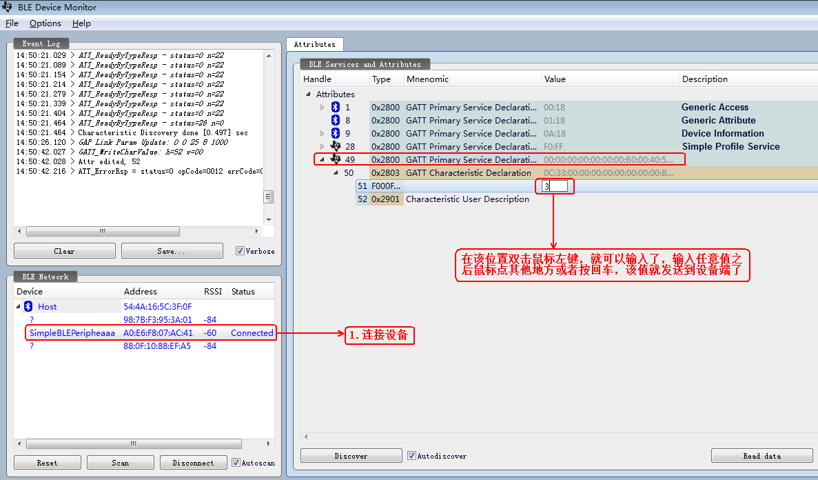成功烧录之后,我们用PC端的BLE Device Monitor工具进行搜索和连接,之后可以看到相应的服务和特征值,截图如下: