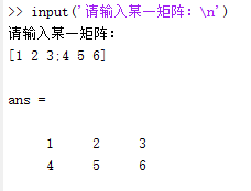 (2)输入某一矩阵:在命令行窗口中输入“ input('请输入某一矩阵:n')”,按回车键,如下图所示: