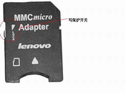 Lenovo MMCmicro使用时提示写保护时,请察看插接的随机的SD Adapter,在SD Adapter的一侧有写保护开关,请用户将写保护开关拨到另一侧即可。