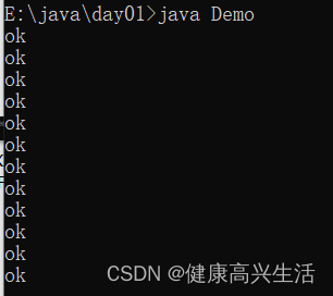 这段代码是这样的,for循环被执行,就在内存当中产生一个x变量块初始化值为0。满足条件以后执行循环体,只不过此时的循环体比较特殊,它还是一个循环。然后再按照for循环再读下面一个循环,满足循环就会打印一次ok。紧跟着y++,不读x++,那什么时候读x++呢?这个时候就需要里面嵌套的这个循环体执行之后再x++。然后这个执行完之后就会打印12次ok。结果如图所示。