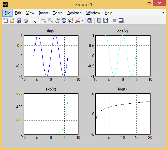 1.把当前窗口分成四个区域,用不同的颜色和线条分别绘制sin(x),cos(x),e^x,log(x)的函数图形,并加入文字标示和网格。
