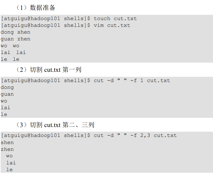 在文件中负责剪切数据。cut 命令从文件的每一行剪切字节、字符和字段并将这些字节、字符和字段输出